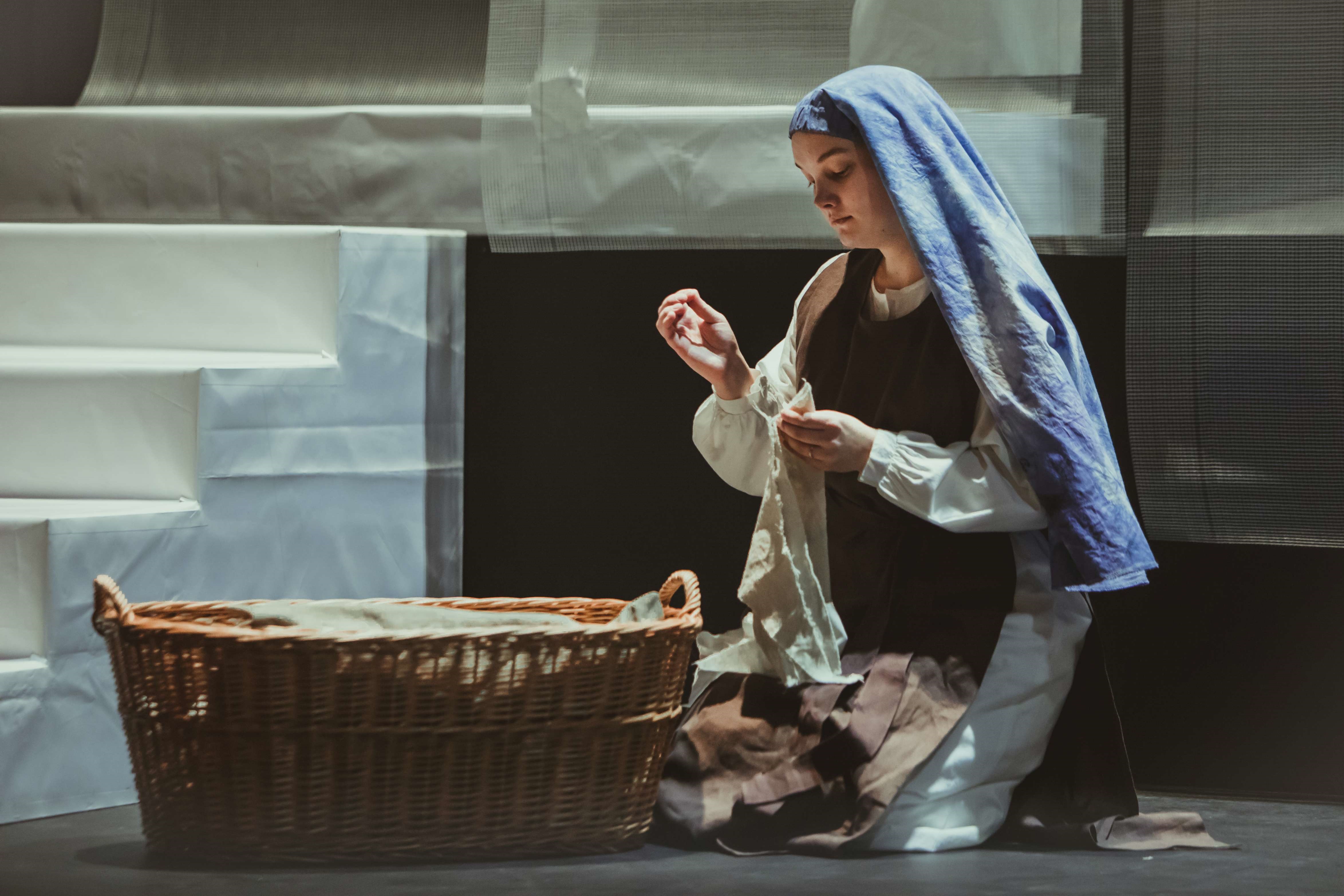 Scéna k opeře je dílem výtvarnice Terezy Jančové, která použila perlinku tedy stavební materiál na zateplování domů. „Tato mřížka ze skelných vláken se podobá textilnímu tylu a jdou z ní vytvořit přesné kompozice,“ komentovala volbu látky. Julie Ema Růžičková, která jako kostýmní výtvarnice účinkující oblékala, zčásti využila historický vzhled řeholních hábitů v kombinaci vrchního hnědého roucha a bílé suknice. „Všechna děvčata budou bosá, jak jim to přikazuje jejich řehole,“ doplnila Růžičková.