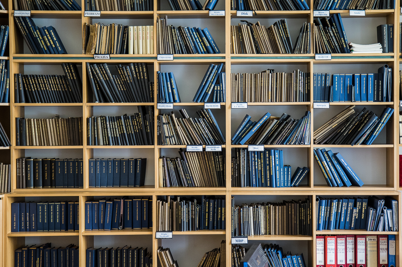 Foto: svázané divadelní programy ve Studovně Informačně-dokumentačního oddělení, NIK - Divadelní ústav.